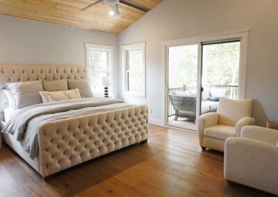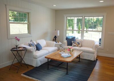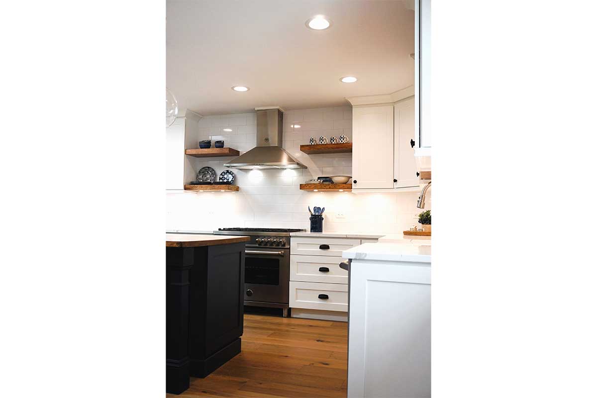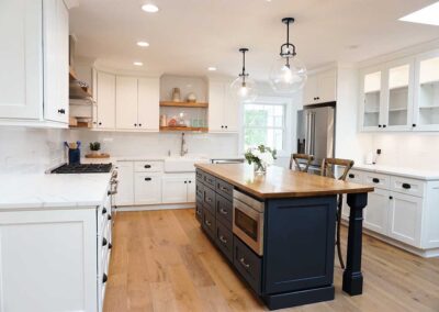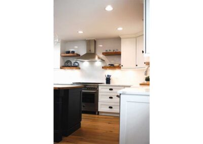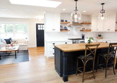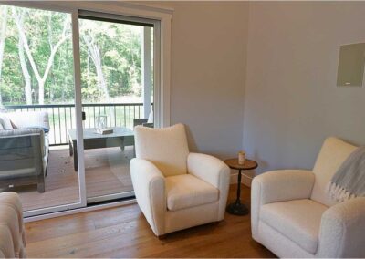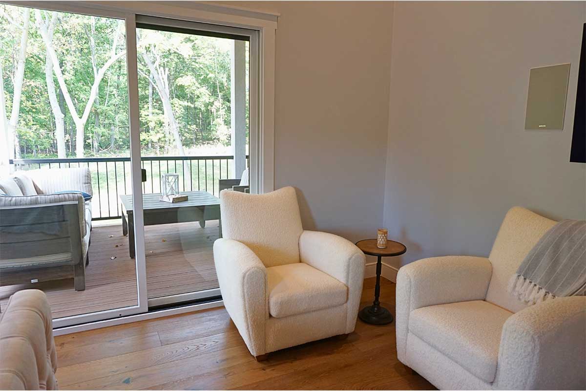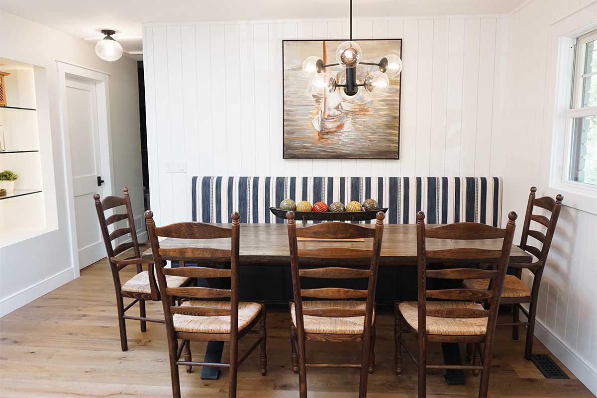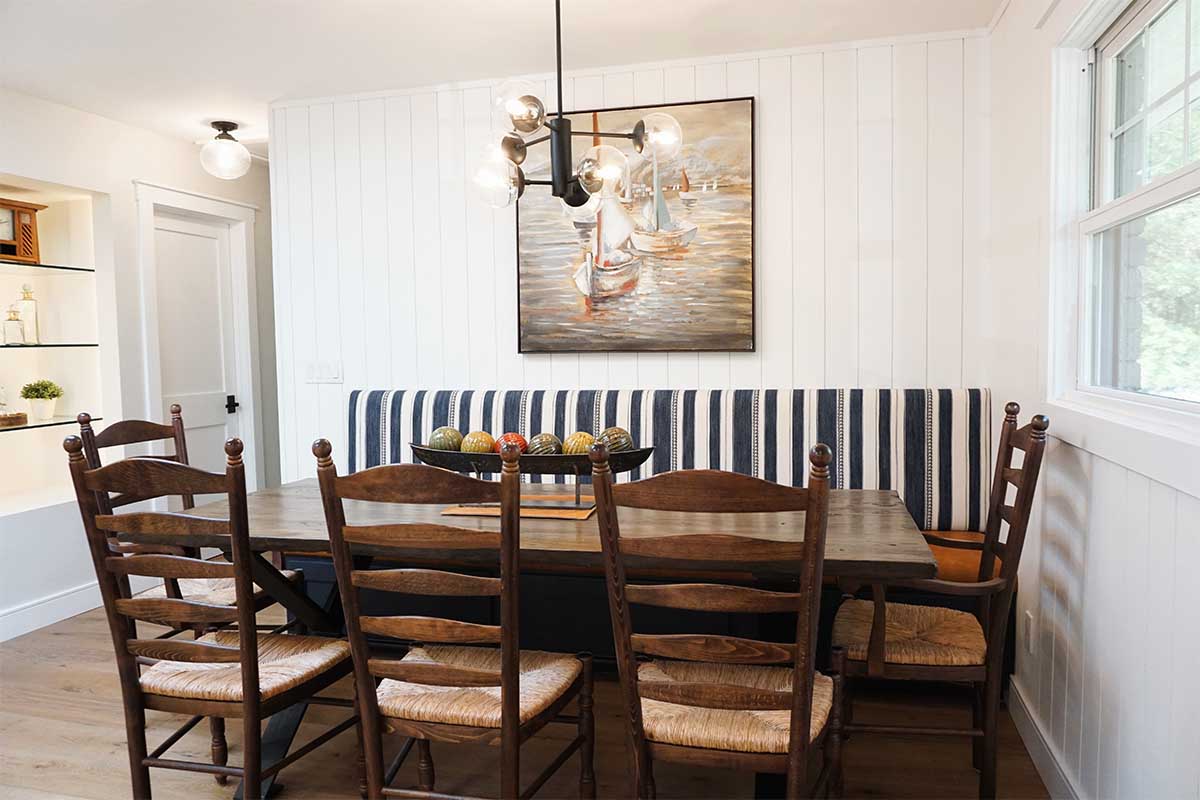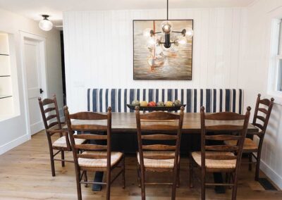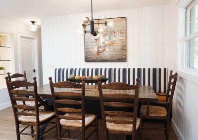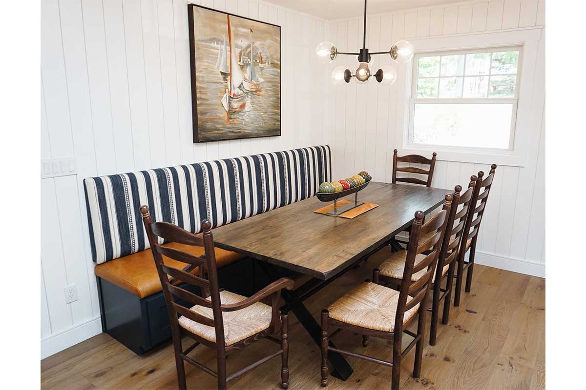 Set on a rolling, wooded, professionally landscaped half-acre, views and natural serenity surround you. Inside, the open floor plan is accented by vaulted spaces and unique finishes. A highlight is the spectacular ‘unfitted’ kitchen, featuring stainless steel Bertazzoni appliances, crisp cabinetry with natural accents, an island with seating, and a built-in banquette in the adjoining dining area for more seating.