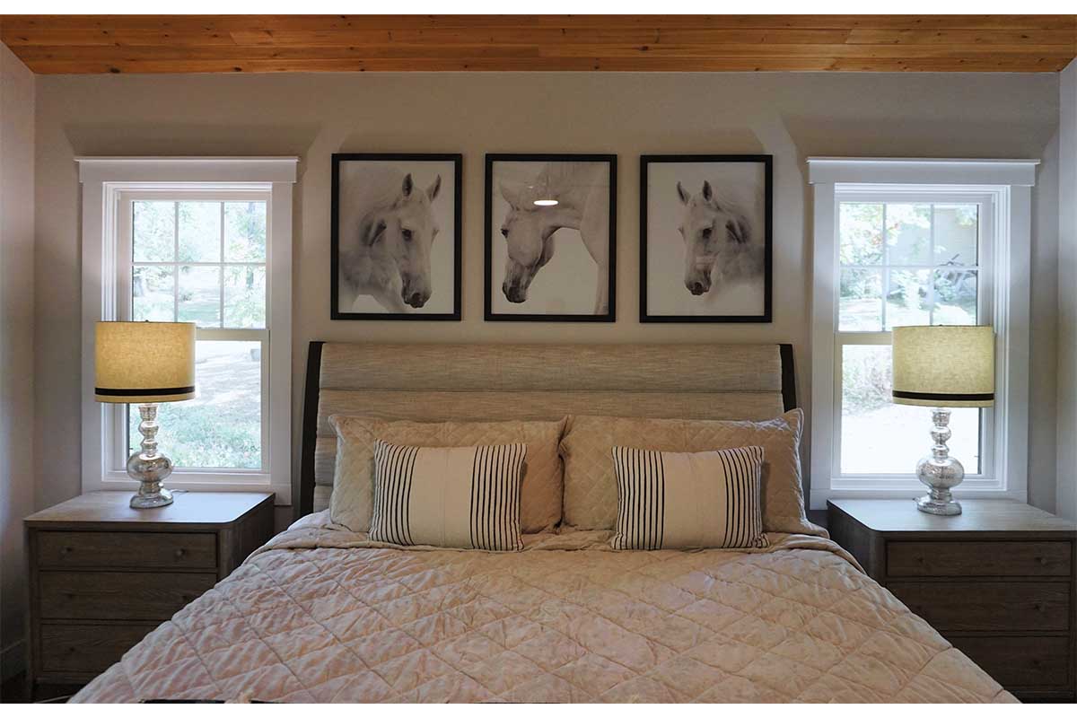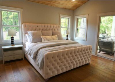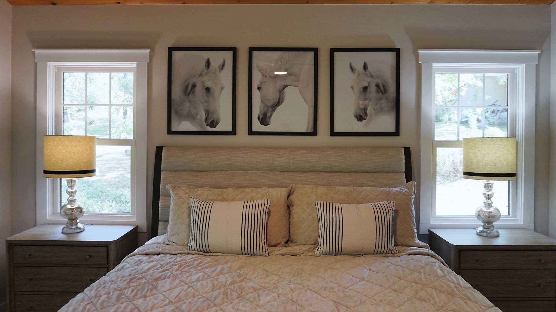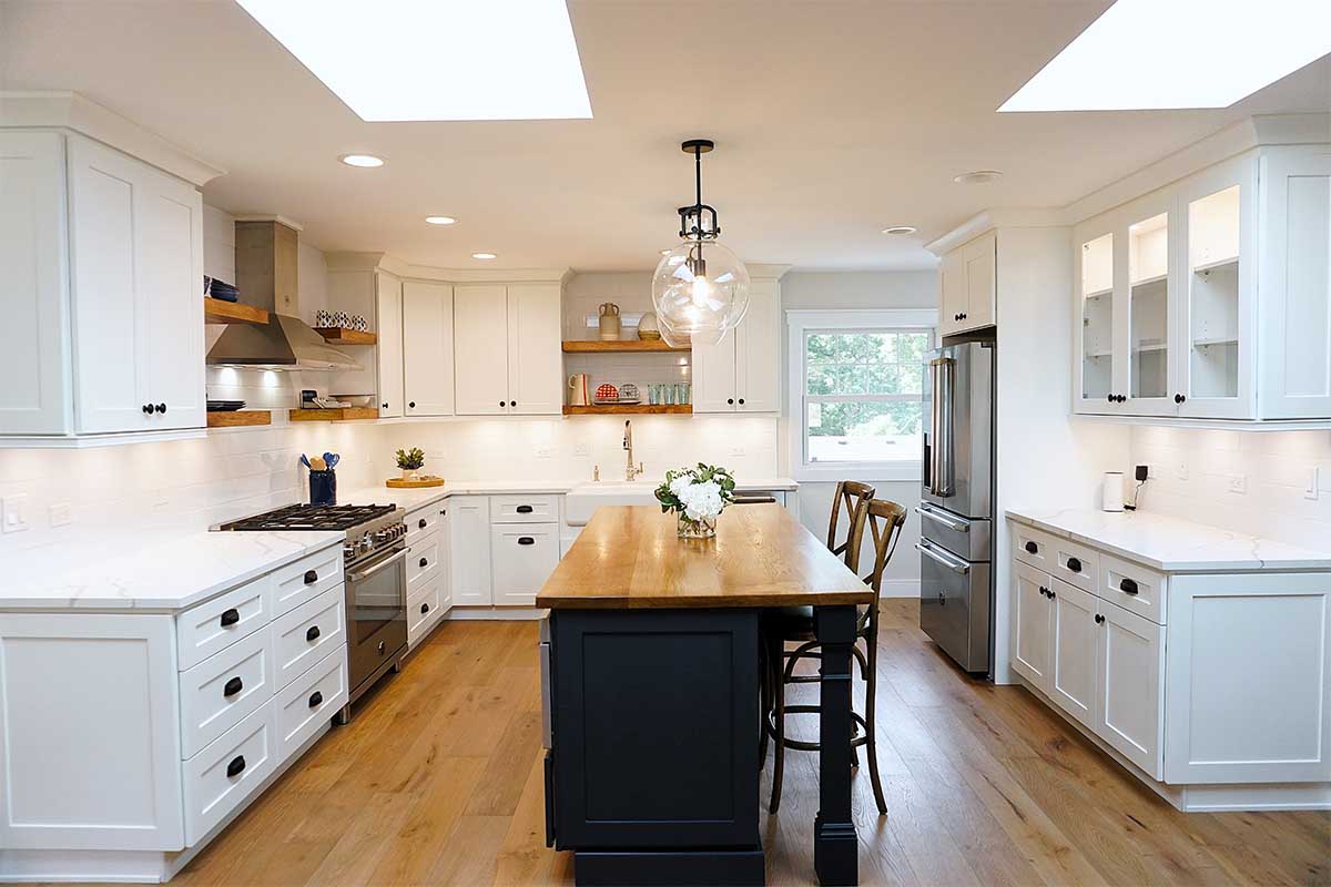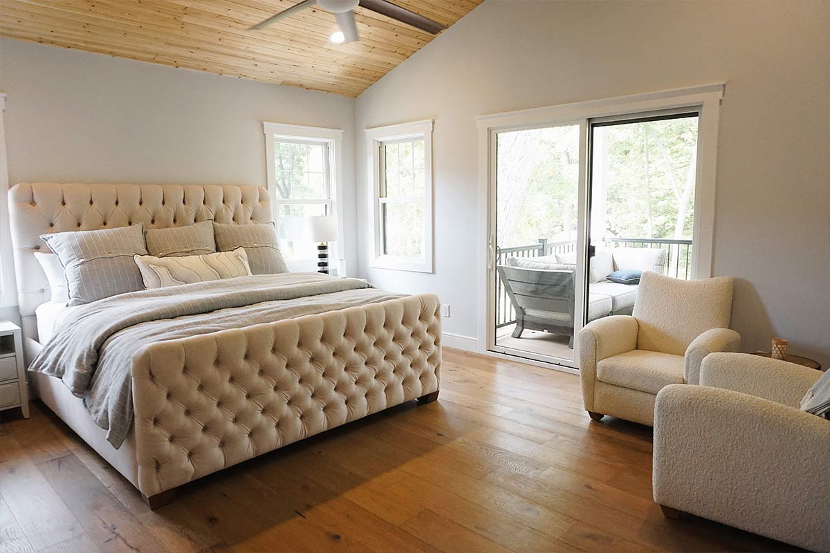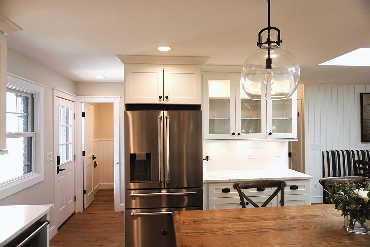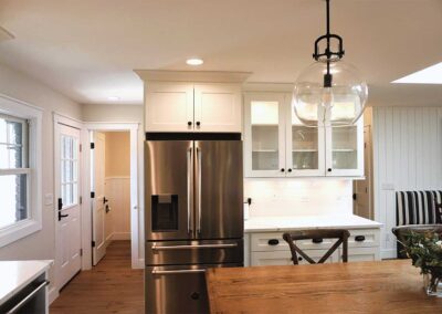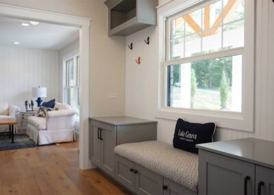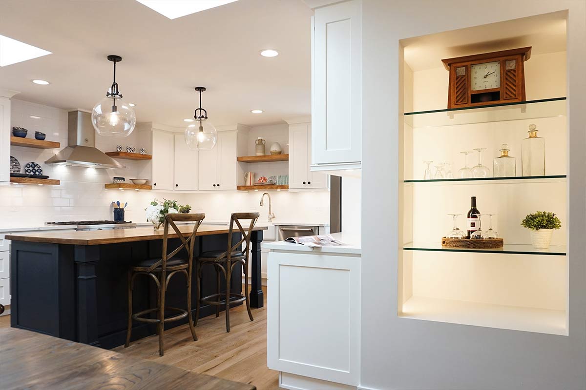 Set on a rolling, wooded, professionally landscaped half-acre, views and natural serenity surround you. Inside, the open floor plan is accented by vaulted spaces and unique finishes. A highlight is the spectacular ‘unfitted’ kitchen, featuring stainless steel Bertazzoni appliances, crisp cabinetry with natural accents, an island with seating, and a built-in banquette in the adjoining dining area for more seating.